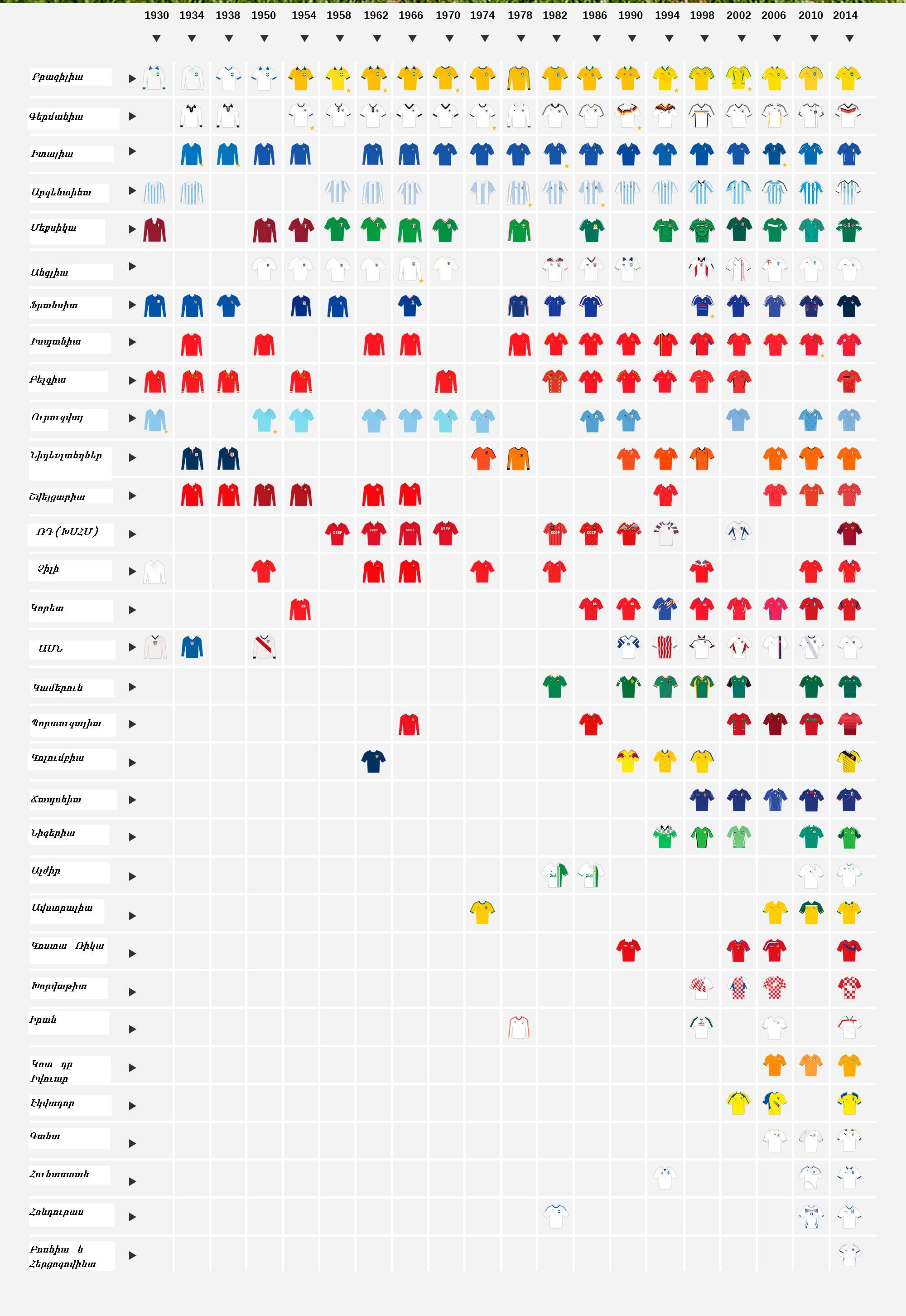 Ֆուտբոլի Աշխարհի առաջնություն. ազգային հավաքականների մարզաշապիկների էվոլուցիան June 10, 2014 13:07 Շուտով սկսվելու են Ֆուտբոլի Աշխարհի 20-րդ առաջնությունը, որի եզրափակիչ մրցաշարը կանցկացվի 2014 թվականի հունիսի 12-ից հուլիսի 13-ը, Բրազիլիայում։ Ողջ աշխարհը սպասում է այս կարևորագույն միջոցառումներից ...