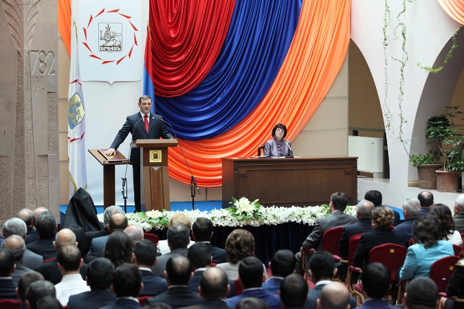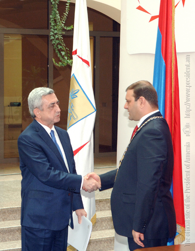 Սերժ Սարգսյանը ներկա է գտնվել Երևանի նորընտիր քաղաքապետի երդմնակալության արարողությանը June 11, 2013 14:30 Նախագահ Սերժ Սարգսյանն այսօր ներկա է գտնվել Երևանի ավագանու հատուկ նիստում Երևանի նորընտիր քաղաքապետ Տարոն Մարգարյանի պաշտոնը ստանձնելու երդման հանդիսավոր արարողությանը: Նախագահը շնորհավորել է Տարո ...