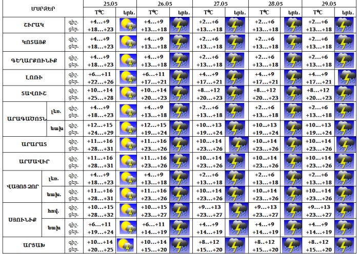 ՀՀ տարածքում մայիսի 25-ին գիշերվա առաջին կեսին և օրվա երկրորդ կեսին, 26-29-ը ժամանակ առ ժամանակ շրջանների զգալի մասում սպասվում է անձրև և ամպրոպ, առանձին վայրերում հնարավոր է կարկուտ: