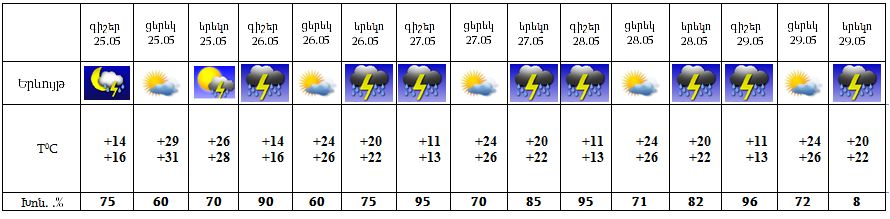 Երևանում մայիսի 25-ին գիշերվա առաջին կեսին և օրվա երկրորդ կեսին, 26-29-ը ժամանակ առ ժամանակ սպասվում է անձրև և ամպրոպ, ամպրոպի ժամանակ քամու ուժգնացում 18-23մ/վրկ: