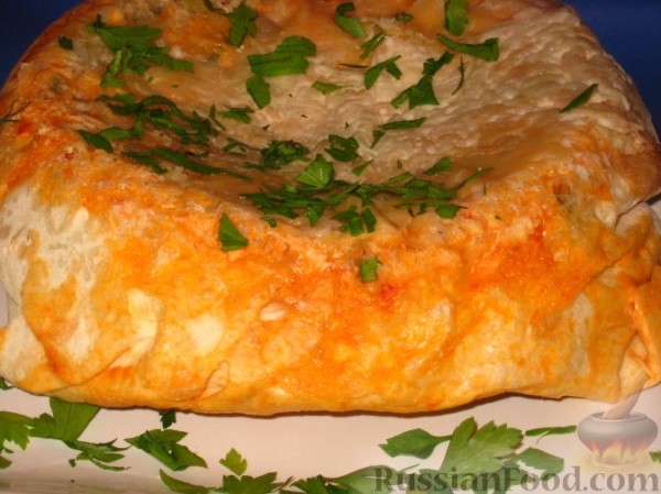 Տապակի վրա փռել լավաշն այնպես, որ ծայրերը տապակից դուրս լինեն: Վրան լցնել միջուկի կեսը, դրա վրա ավելացնել ձվով խառնուրդի երրորդ մասը, ծածկել լավաշի մի կողով (կամ լավաշի երկրորդ շերտով) և ավելացնել նույն կերպ միջուկի մնացածը: Վրան լցնել ձվով խառնուրդը, ծածկել լավաշի մյուս կողմով ու լցնել նույն խառնուրդի մնացած մասը: Տապակը դնել 180օտաքացրած ջեռոցը և թխել` մինչև վարդագունելը: