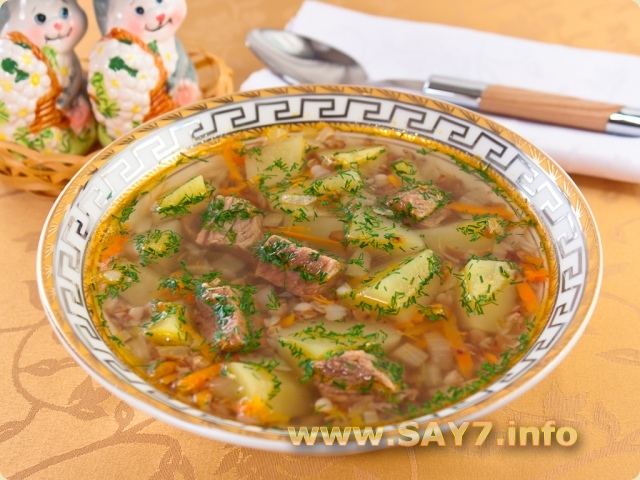 Միսը կտրատել ոչ մեծ կտորներով, ապա կաթսայի մեջ 1,5 ժամ խաշել: Սոխը մանր կտրատել, գազարը քերել խոշոր քերիչով, կարտոֆիլը կտրատել խորանարդներով: Հնդկաձավարը տապակի մեջ բովել: Ձեթով տապակել սոխը, ավելացնել գազարը: Արգանակով կաթսայի մեջ գցել կարտոֆիլը և աղ ավելացնել: Երբ արգանակը եռա, ավելացնել հնդկաձավարը ու եփել 10 րոպե, ապա` գազարով սոխեռածն ու եփել մինչև պատրաստ լինելը: