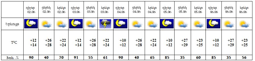 Երևանում հունիսի 2-ին, 4-ին, 6-ին երեկոյան ժամերին հնարավոր է ամպրոպ, անձրևի հավանականությունը փոքր է, 3-ին երեկոյան ժամերին սպասվում է կարճատև անձրև և ամպրոպ, ամպրոպի ժամանակ քամու ուժգնացում` 13-18 մ/վրկ: Հունիսի 5-ին սպասվում է
