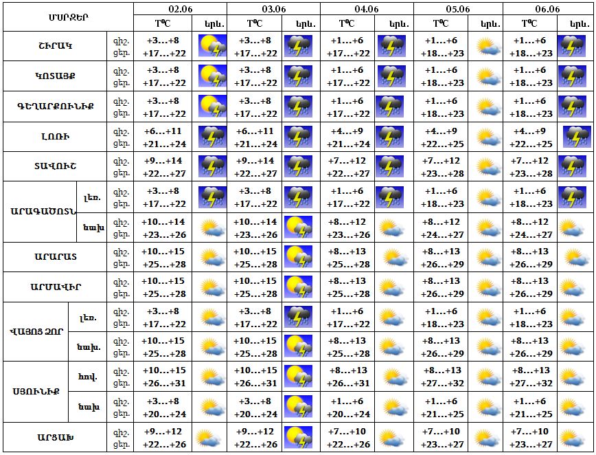 ՀՀ տարածքում հունիսի 2-ին, 4-ին, 6-ին գիշերվա առաջին կեսին և օրվա երկրորդ կեսին հյուսիսային շրջաններում, 3-ին շրջանների զգալի մասում սպասվում է կարճատև անձրև և ամպրոպ, առանձին վայրերում հնարավոր է կարկուտ. այս մասին տեղեկացնում են ԱԻՆ Հիդրոմետ ծառայությունից: Հունիսի 5-ին սպասվում է առանց տեղումների եղանակ: Քամին` արևմտյան` 2-7 մ/վրկ, ամպրոպի ժամանակ սպասվում է քամու ուժգնացում` 15-20 մ/վրկ: Օդի ջերմաստիճանը էապես չի փոխվի: