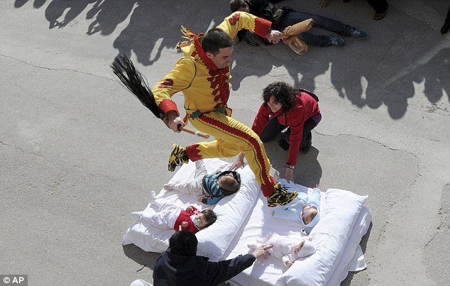 Արարողաության ժամանակ ծնողները իրենց երեխաներին պառկեցնում են ներքնակի վրա, և սատանային խորհրդանշող դեղին համազգեստով տղամարդը ցատկում է նրանց վրայով: