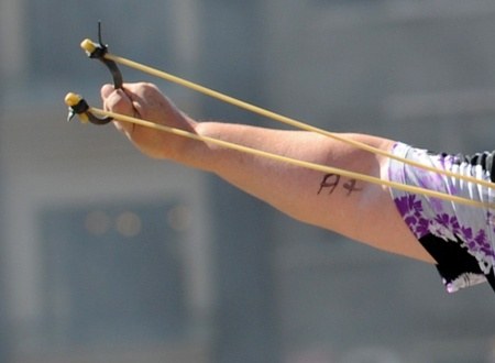 հակագազով, իսկ ձեռքին պարսատիկ, որով ոստիկանների ուղղությամբ քարեր է նետում։