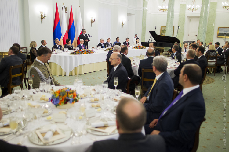 Նախագահ Սերժ Սարգսյանն իր բաժակաճառում շնորհակալություն է հայտնել ջերմ հյուրընկալության համար, ապա անդրադարձել դարերի խորքից եկող հայ-լեհական բարեկամությանը, պատմական սերտ առնչությունների վրա կառուցված միջպետկան հարաբերություններին և Լեհաստանի հասարակական-քաղաքական կյանքում ակտիվ դերակատարում ունեցող լեհահայ համայնքին ու հայ-լեհական հարաբերությունների հեռանկարին:
