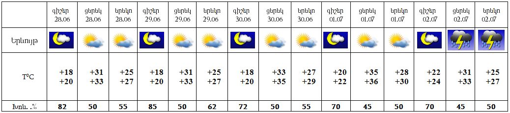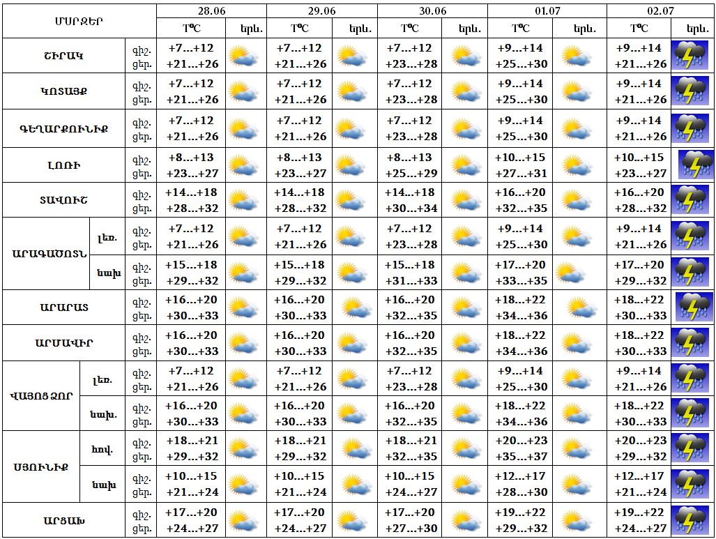 Հանրապետության տարածքում հունիսի 28-29-ին առավելապես օրվա երկրորդ կեսին` առանձին շրջաններում, հնարավոր է կարճատև անձրև և ամպրոպ, հունիսի 30-ին և հուլիսի 01-ին սպասվում է առավելապես առանց տեղումների եղանակ, հուլիսի 02-ին շրջանների զգալի մասում սպասվում է անձրև և ամպրոպ, հնարավոր է կարկուտ, ամպրոպի ժամանակ սպասվում է քամու ուժգնացում մինչև 15-20 մ/վրկ: Քամին արևմտյան 2-7 մ/վրկ: Օդի