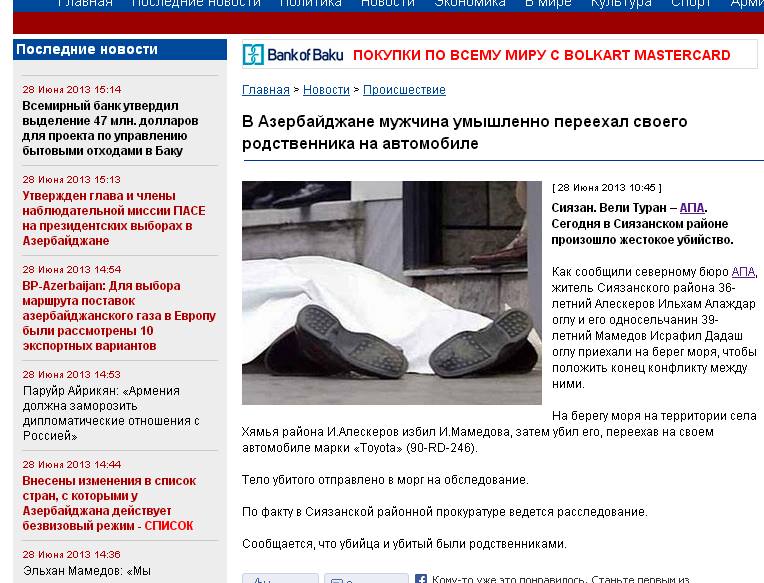 Ադրբեջանական «ԱՊԱ» գործակալությունը այսօր առավոտյան մի լուր է հրապարակել Սիյազանի շրջանում 39-ամյա քաղաքացու դաժան սպանության մասին իր իսկ ընկերոջ կողմից: Առաջին հայացքից սա սովորական մի լուր է և ոչ մի հետաքրքրություն իրենից չի ներկայացնում: Սակայն ուշադիր նայելով գործակալության կայքի հրապարակմանը կարելի է հեշտությամբ նկատել, որ լուրի համար որպես լուսանկար օգտագործվել է 2007 թվականին սպանված պոլսահայ նշանավոր լրագրող Հրանտ Դինքի հայտնի լուսանկարը, որը հուզել էր միլիոնավոր մարդկանց: Հարց է ծագում՝ արդյո՞ք «ԱՊԱ» գործակալությունը միտումնավոր է տեղադրել հենց այդ լուսանկարը, և եթե այո, ապա ի՞նչ նպատակ է այն հետապնդում: