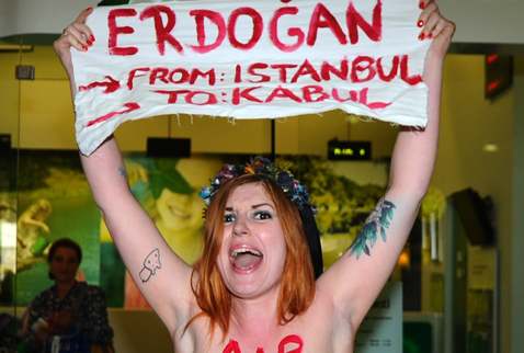 Վերջին օրերին Թուրքիայում հաճախակի դարձած ցույցրի առիթով ուկրաինական հայտնի «Femen» շարժման ակտիվիստներից մեկը ցույց է կազմակերպել Ստամբուլի Սաբիհա Գյոքչեի անվան օդանավակայանում: Վերջինս առանց վերնազգեստի է եղել և կրել է միայն «Դու՛րս արի Ստամբուլից, գնա՛ Քաբուլ» գրությամբ պաստառ: Ցուցարարի մարմնի վրա էլ է գրություն եղել, ինչը հատուկ է այս շարժման ակցիաներին: Բոլորի ուշադրությունը գրավել է կնոջ մարմնին գրված «բռնապետ Էրդողան» բառերը: