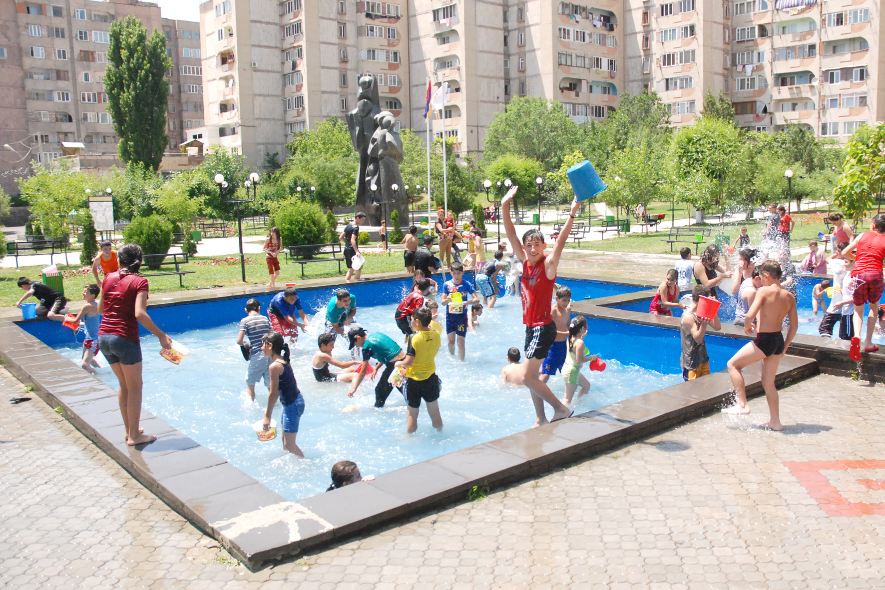 Մանուկների համար օրն իրապես տոնական է դարձել բակային տարածքներում: Տոնի խորհրդով միմյանց վրա ջուր ցողելու ավանդույթը պահելու նպատակով` բնակիչներին ջրով ապահովելու համար ջրցան մեքենաները շրջել են վարչական շրջանի տարբեր թաղամասերով ու բակային տարածքներով: