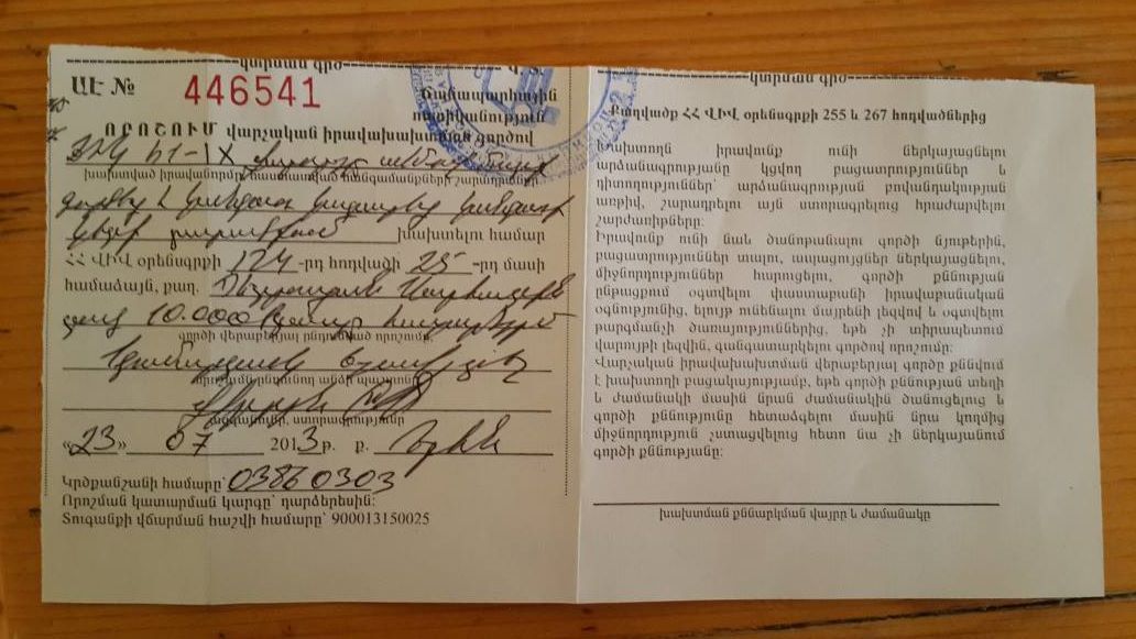 Ֆրանսիայի հրապարակից Կոմիտասի պողոտա տանելիս կանգնեցվել եմ 547 ՈՍ 01 պետամարանիշով ճանապարհային ոստիկանության ավտոմեքենայի կողմից։ Հուլիսի 25-ին ծանուցվել եմ այն մասին, որ տուգանվել 10.000 դրամի չափով 038603030 կրծքանշանով ճանապարհային տեսուչի կողմից, բողոքարկման իրավունքով։