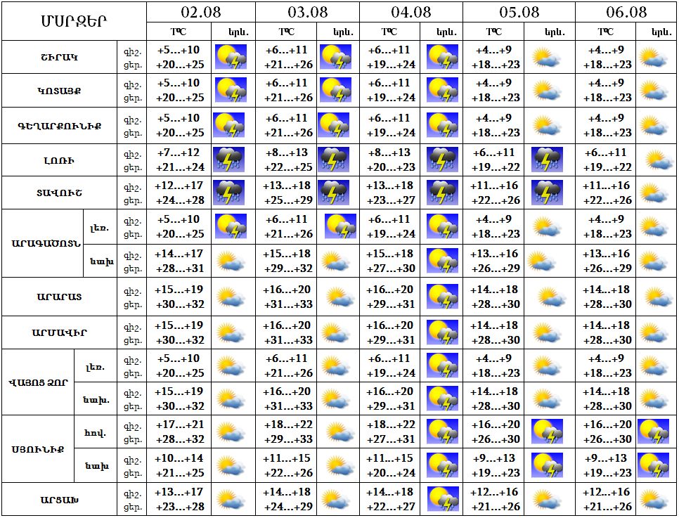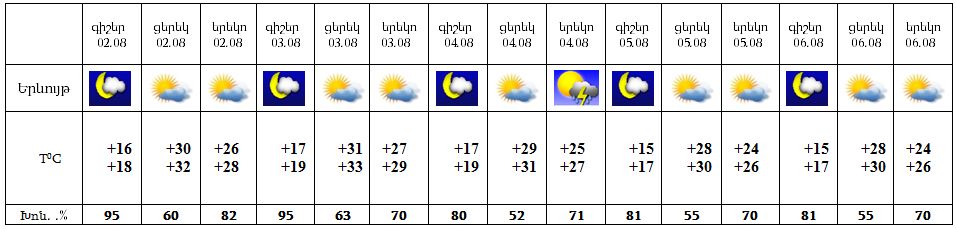 Երևանում օգոստոսի 2-3-ը, 5-6-ը երեկոյան ժամերին հնարավոր է ամպրոպ, տեղումների հավանականությունը փոքր է: Օգոստոսի 4-ին օրվա երկրորդ կեսին սպասվում է կարճատև անձրև և ամպրոպ, ամպրոպի ժամանակ քամու ուժգնացում` մինչև 15-20 մ/վրկ: