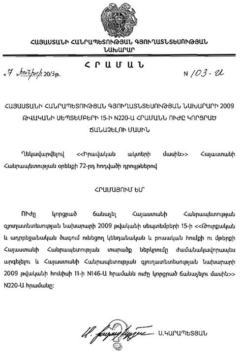 Եվ ահա 2013 թ. հունիսի 7-ին ՀՀ գյուղատնտեսության նախարար Սերգո Կարապետյանը ստորագրեց N 03-Ա հրամանը, որով ուժը կորցրած է ճանաչվում ՀՀ գյուղատնտեսության նախարարի 2009 թ. սեպտեմբերի 15-ի «Թուրքական և ադրբեջանական ծագում ունեցող կենդանական և բուսական հումքի ու մթերքի ՀՀ տարածք ներկրումը ժամանակավորապես արգելելու և ՀՀ գյուղատնտեսության նախարարի 2009 թ. հունիսի 11-ի N146-Ա հրամանն ուժը կորցրած ճանաչելու մասին» N220-Ա հրամանը: Այսպիսով, ինչպես կարծում են շատերը, հերթական հարվածն է հասցվում Հայաստանի Հանրապետության տնտեսությանը: