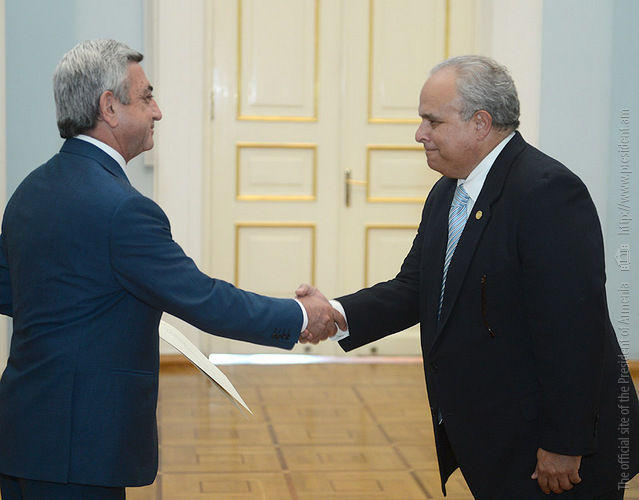 Նախագահ Սերժ Սարգսյանին այսօր իր հավատարմագրերն է հանձնել Հայաստանի Հանրապետությունում Գվատեմալայի Հանրապետության նորանշանակ արտակարգ և լիազոր դեսպան Էրբերտ Էստուարդո Մենեսես Կորոնադոն (նստավայրը՝ Մոսկվա):