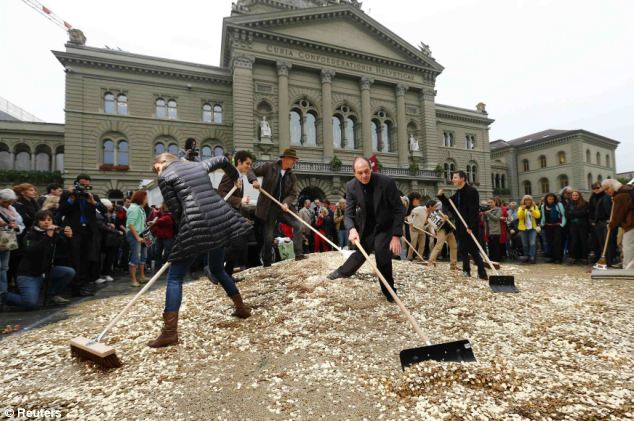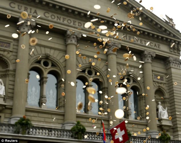 Ակտիվիստները շվեյցարիայի Բազել քաղաքի Volksbank բանկի անվտանգության սենյակում թափել են յուրաքանչյուր քաղաքացուն խորհրդանշող հինգ ցենտանոց մետաղադրամների 8 միլիոն կապոց: