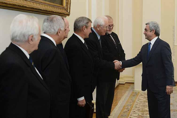 Նախագահ Սերժ Սարգսյանն այսօր ընդունել է ՀՀ գիտությունների ազգային ակադեմիայի հիմնադրման 70-ամյակի տոնակատարությունների շրջանակում Երևան ժամանած ավելի քան մեկ տասնյակ երկրների գիտությունների ակադեմիաների նախագահներին: Հանրապետության Նախագահը ողջունել է անվանի գիտնականներին Հայաստանում, շնորհակալություն հայտնել ՀՀ ԳԱԱ հիմնադրման հոբելյանական միջոցառումներին նրանց մասնակցության համար: Սերժ Սարգսյանը բարձր է գնահատել 70-ամյա փառավոր ուղի անցած Հայաստանի գիտությունների ազգային ակադեմիայի գործունեությունը, ընդգծելով, որ տասնամյակներ շարունակ մեր գիտնականներն իրենց մեծ ներդրումն են ունեցել գիտության և Հայաստանի սոցիալ-տնտեսական զարգացման գործում: Սերժ Սարգսյանը հույս է հայտնել, որ ՀՀ ԳԱԱ գիտնականները նույնպիսի նվիրումով կշարունակեն իրենց կարևորագույն աշխատանքը՝ տարեցտարի ակադեմիայի գիտնականների շարքերը համալրելով երիտասարդներով, առանց որոնց, Նախագահի համոզմամբ, գիտության զարգացումը հեռանկար ունենալ չի կարող: Ակադեմիայի առկա ձեռքբերումները Հանրապետության Նախագահը պայմանավորել է նաև միջազգային ակտիվ համագործակցությամբ: Նրա խոսքով, ցանկացած երկրի համար դժվար է պատկերացնել արդի պահանջներին համապատասխան գիտության զարգացումն առանց այդ փոխգործակցության: Նախագահը կարևորել է ինչպես երկկողմ ձևաչափում, այնպես էլ միջազգային ծրագրերի և տարբեր կազմակերպությունների շրջանակներում համագործակցությունը, որի լավագույն օրինակներից մեկն էլ չորս տասնյակ երկիր միավորող Գիտությունների համաեվրոպական ազգային ակադեմիաների ֆեդերացիան է, որի անդամ է նաև Հայաստանի գիտությունների ազգային ակադեմիան: Հանդիպմանը ՀՀ ԳԱԱ նախագահ Ռադիկ Մարտիրոսյանը շնորհակալություն է հայտնել Հանրապետության Նախագահին՝ ակադեմիան մշտապես պետական ուշադրության ներքո պահելու, գիտնականներին և հատկապես երիտասարդ գիտնականներին աջակցություն ցուցաբերելու, խրախուսելու համար: Հանդիպմանը ներկա երկրների ակադեմիաների նախագահները Հանրապետության Նախագահի հետ զրուցել են գիտության արդի մարտահրավերների, դրանց դիմակայելու հնարավորությունների և գիտության զարգացման հեռանկարների մասին: Նրանք ևս կարևորել են ակադեմիաների ակտիվ համագործակցությունը, միաժամանակ բարձր գնահատելով Հայաստանի գիտությունների ազգային ակադեմիայի հետ տարիներ ի վեր գոյություն ունեցող իրենց արդյունավետ համագործակցությունը: Գիտնականները դրվատանքով են խոսել նաև պետության կողմից Հայաստանի ակադեմիայի նկատմամբ ցուցաբերվող հոգածության, գիտնականների աշխատանքը գնահատելու և Հայաստանի գիտության զարգացմանն ուղղված ջանքերին աջակցելու մասին: Հանդիպման ավարտին Սերժ Սարգսյանն անվանի գիտնականներին հրավիրել է մասնակցելու և իրենց ներկայությամբ պատվելու Նախագահի նստավայրում հանդիպումից անմիջապես հետո անցկացվելիք տեղեկատվական տեխնոլոգիաների բնագավառում ՀՀ Նախագահի 2013թ. կրթական պարգևների հանձնման հանդիսավոր արարողությունը, շփվելու հայ տաղանդաշատ աշակերտների և ուսանողների հետ, խրախուսելու նրանց: Գիտնականները սիրով ընդունել են Նախագահի հրավերը՝ մասնակցելով միջոցառմանը: |