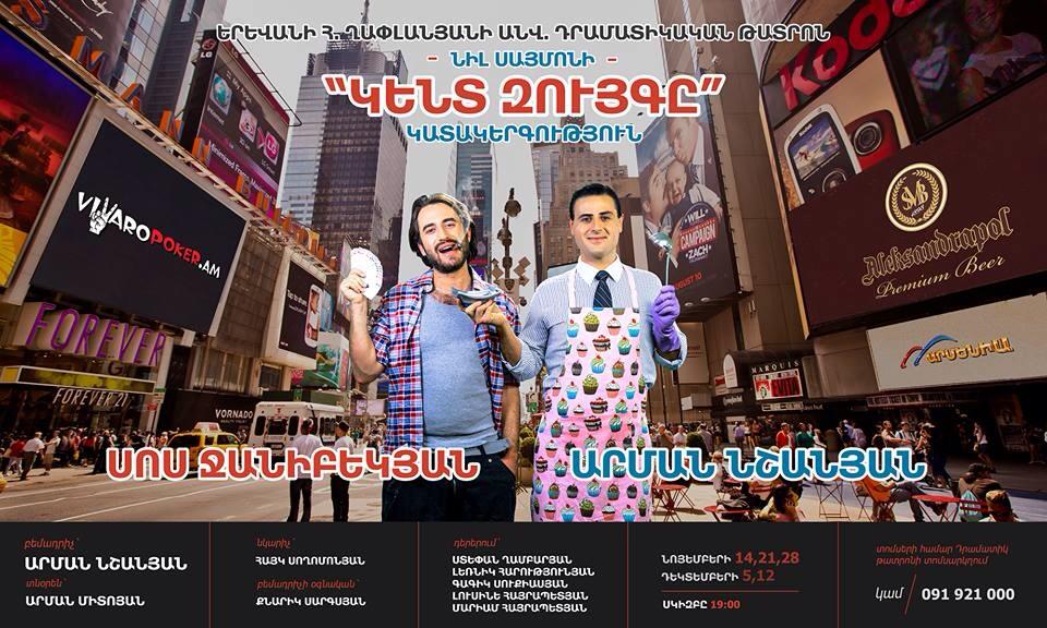 Նոյեմբերի 14-ին Հրաչյա Ղափլանյանի անվան դրամատիկական թատրոնում կայացավ Արման Նշանյանի «Կենտ զույգը» կատակերգության պրեմիերան: Կլասիկ-կոմեդիան ամերիկացի դրամատուրգ Նիլ Սայմոնի համանուն ստեղծագործության հիման վրա էր: Գլխավոր դերերում էին Սոս Ջանիբեկյանն ու Արման Նշանյանը: Նրանք մտերիմ ընկերներ էին՝ տարակարծիք ու խիստ տարբեր: Ամուսնալուծությունից հետո որոշում են միասին ապրել՝ փորձելով կոտրել միայնությունն ու կանանց կողմից լքված լինելու զգացումը: Խենթ արարքներն ու զավեշտալի իրավիճակները հետապնդում են տղաներին: Դերասանները ստեղծված իրավիճակից յուրովի են դուրս գալիս, գտնում զանազան լուծումներ, հանդիսատեսին պարգեւում լիաթոք ծիծաղ: Ներկայացման բեմադրիչ Արման Նշանյանը archive2.ankakh.com-ի հետ զրույցում նշեց, որ Նիլ Սայմոնի բոլոր գործերն իրեն հարազատ են.