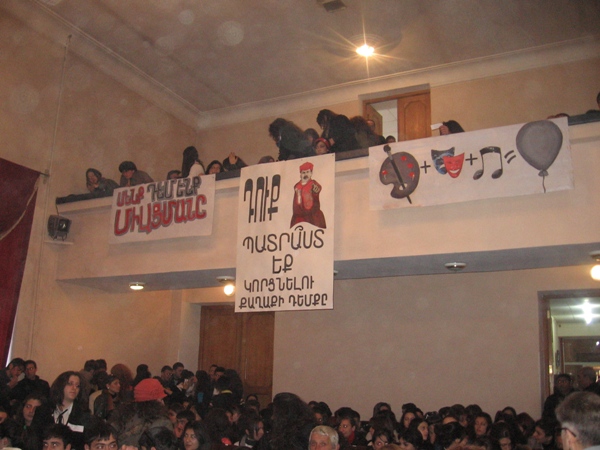 Գյումրեցի ուսանողները նախարարին դիմավորեցին պաստառներով, որոնք արտահայտում էին իրենց տեսակետը, ինչը նախարարը շատ խուսուն համարեց: