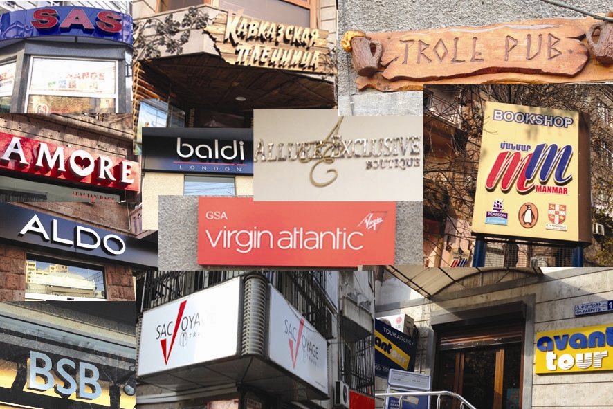 Մինչդեռ մեր քաղաքում զբոսնելիս օտարերկրացին չի կարող ամեն քայլափոխի չնկատել անթաքույց օտարամոլության վառ օրինակները ` օտարալեզու ցուցանակները, գովազդը, հայտարարությունները, տաքսի ծառայության մեքենաների անհասկանալի ու անհեթեթ անվանումները: