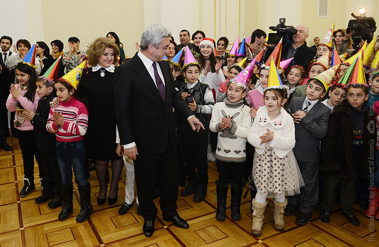 Նախագահ Սերժ Սարգսյանը և տիկին Ռիտա Սարգսյանը Նախագահի նստավայրում Ամանորի և Սուրբ Ծննդյան տոների կապակցությամբ այսօր հյուրընկալել են սահմանամերձ բազմաթիվ գյուղերի՝ Գեղարքունիքի մարզի Ճամբարակ, Վահան, Վայոց Ձորի մարզի Խնձորուտ, Բարձրունի, Խաչիկ, Սերս, Արարատի մարզի՝ Երասխ, Տավուշի մարզի Բարեկամավան, Բերդավան, Դովեղ, Բաղանիս գյուղերի՝ թվով 200 երեխաների: Փոքրիկ հյուրերի ներկայությամբ հանդիսավորությամբ վառվել են նստավայրի տոնածառի լույսերը, և մեկնարկել է տոնական միջոցառումը: