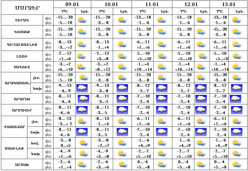 Արարատյան դաշտում և նրա նախալեռներում սպասվում է մառախուղ, մառախուղից` թույլ ձյուն: Քամին արևմտյան` 1-5 մ/վրկ: Օդի ջերմաստիճանը հունվարի 10-11-ին կբարձրանա 2-4 աստիճանով: