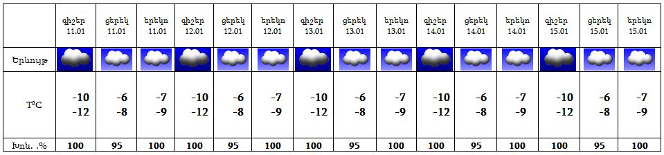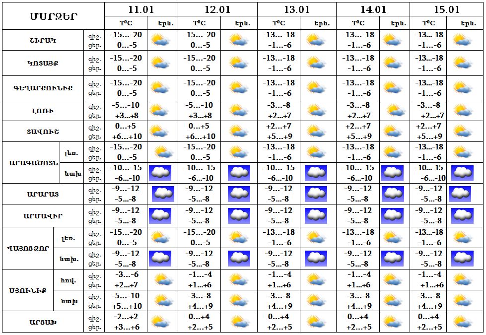 Հանրապետության տարածքում հունվարի 11-15-ին սպասվում է առանց տեղումների եղանակ, Արարատյան դաշտում և նրա նախալեռներում սպասվում է մառախուղ,