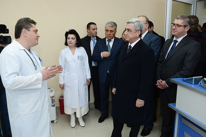 Հանրապետության Նախագահին ներկայացվել է, որ Համաշխարհային բանկի կողմից ֆինանսավորվող «Առողջապահական համակարգի արդիականացում» ծրագրի շրջանակներում լայն թափով շարունակվում են մարզային առողջապահական համակարգերի արդիականացման և օպտիմալացման աշխատանքները: Աբովյանի նորաբաց բժշկական կենտրոնն ըստ այդմ միավորել է Աբովյանի հիվանդանոցը և պոլիկլինիկան: Իրականացված վերակառուցման աշխատանքների արդյունքում, որոնք ավարտվել են 2013թ. դեկտեմբերին, կենտրոնի հիվանդանոցային մասնաշենքում տեղակայվել են անհրաժեշտ բոլոր բաժանմունքներն ու ծառայությունները, առողջապահական հաստատությունը հագեցվել է ժամանակակից բժշկական սարքավորումներով: