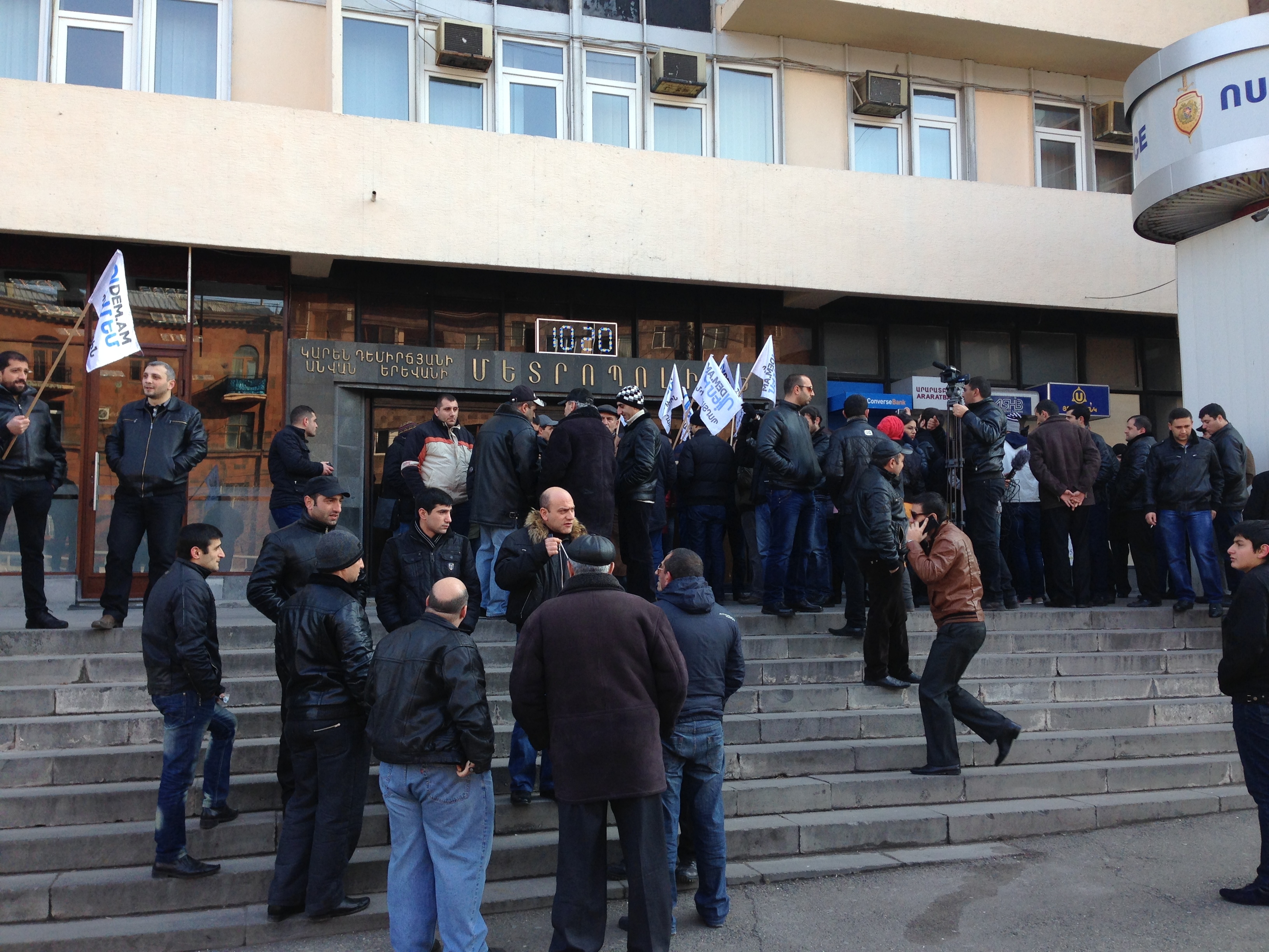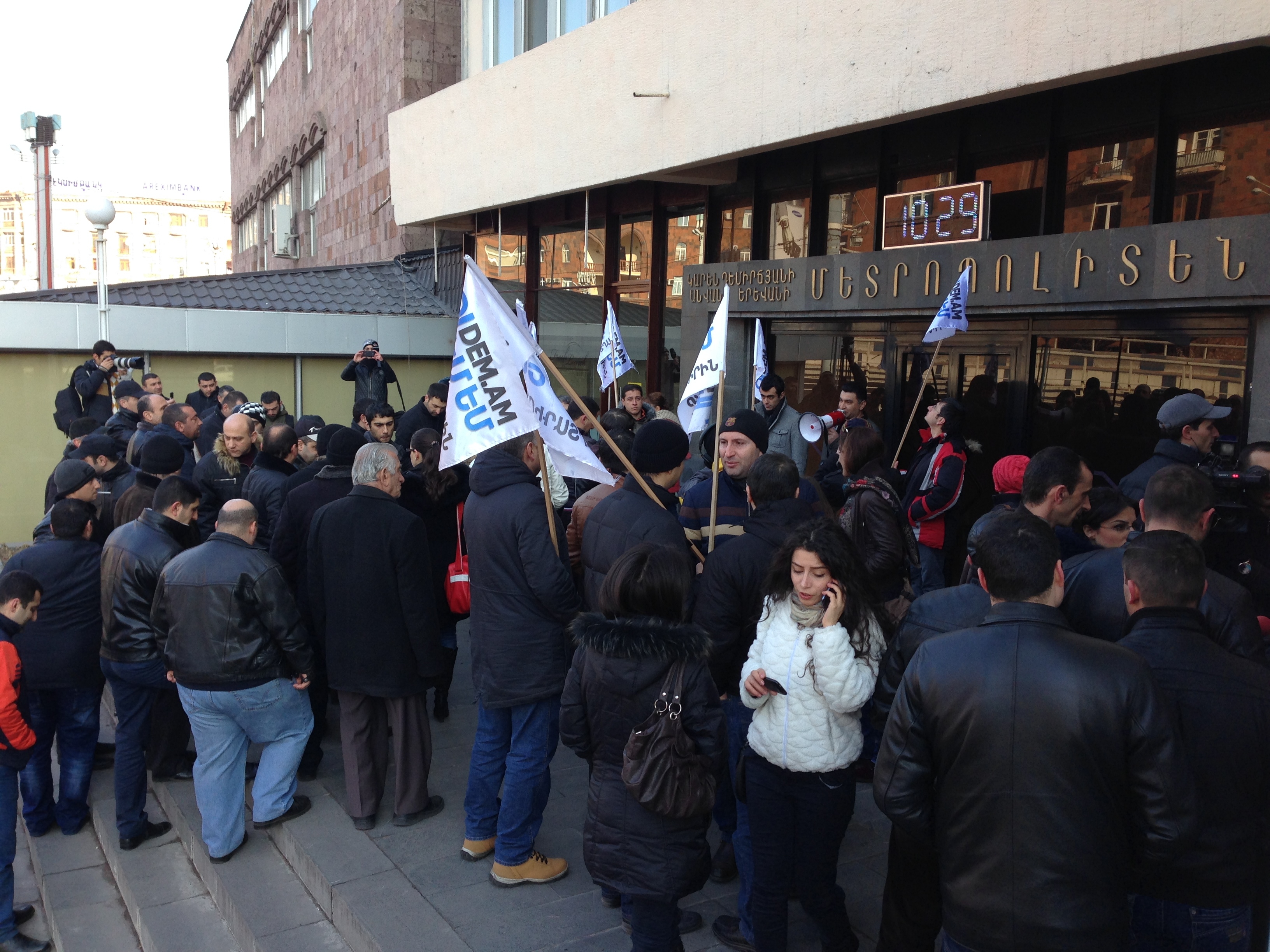 Երևանի մետրոպոլիտենի գլխավոր վարչության շենքի դիմաց այսօր առավոտյան մետրոպոլիտենի մի քանի տասնյակ աշխատակիցներ իրենց բողոքի ձայնն էին բարձրացնում աշխատավարձերից պարտադիր կենսաթոշակային պահումների դեմ: Երկուշաբթի օրը, ստանալով պահումներով աշխատավարձ, աշխատակիցները միավորվել էին և դիմում գրել մետրոպոլիտենի տնօրեն Փայլակ Յայլոյանին` պահանջով, որպեսզի հետ վերադարձնեն իրենցից պահված գումարները: Նամակում նրանք նաև իրենց դժհոգությունն ու անհամաձայնությունն էին հայտնել պարտադիր բաղադրիչի վերաբերյալ: