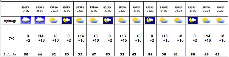 Հանրապետության տարածքում փետրվարի 21-22-ին և 25-ին սպասվում է առանց տեղումների եղանակ, 23-24-ին արևելյան շրջաններում սպասվում են տեղումներ: