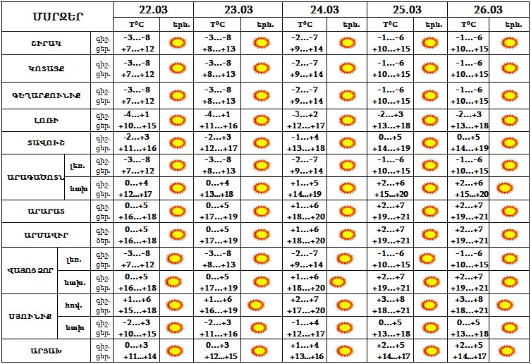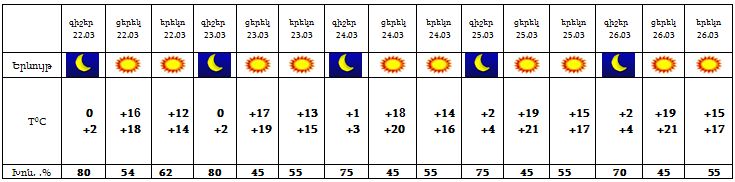 ԱԻՆ հիդրոօդերևութաբանության և մոնիտորինգի պետական ծառայությունից Անկախին տեղեկացնում են, որ մարտի 22-26-ը հանրապետության տարածքում սպասվում է առանց տեղումների եղանակ: