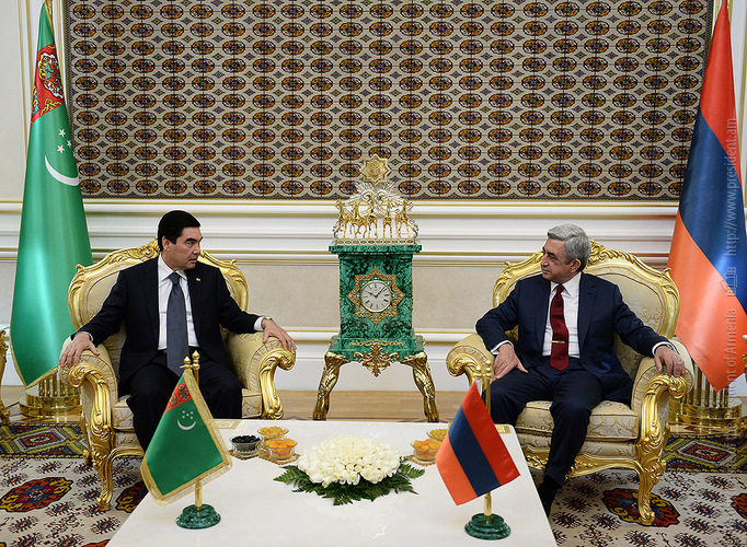 Այսօր Թուրքմենստանի Նախագահի նստավայրում տեղի է ունեցել պաշտոնական այցով Թուրքմենստան ժամանած Նախագահ Սերժ Սարգսյանի դիմավորման պաշտոնական արարողությունը, որից հետո մեկնարկել են Նախագահ Սերժ Սարգսյանի և Թուրքմենստանի Նախագահ Գուրբանգուլի Բերդիմուհամեդովի երկկողմ, ապա երկու երկրների պաշտոնական պատվիրակությունների մասնակցությամբ ընդլայնված ձևաչափով բանակցությունները: Հայ-թուրքմենական բարձր մակարդակի բանակցությունների արդյունքներով ստորագրվել Հայաստանի և Թուրքմենստանի միջև համագործակցության զարգացմանը և խորացմանը վերաբերող են մի շարք փաստաթղթեր: Մասնավորապես ստորագրվել են՝ Թուրքմենստանի արդյունաբերողների և գործարարների միության և