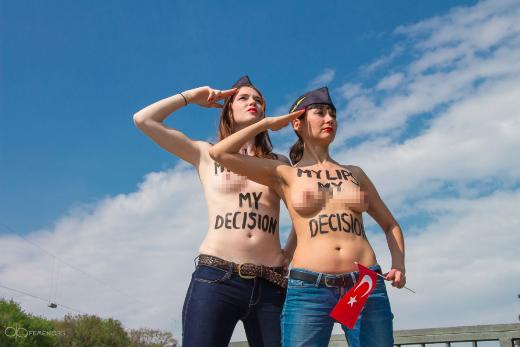 Femen-ի երկու ակտիվիստուհի` թուրքական դրոշները ձեռքներին, գլխներին ուղեկցորդուհիների գլխարկ, կարմիր շրթներկով, լուսանկարվել են: Նրանց մարմնի վրա գրված է ողել “Իմ շրթունքները, իմ որոշումը”: