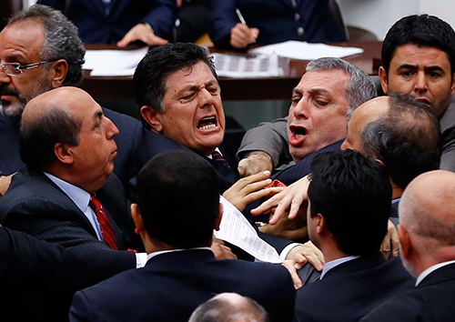 «Ռադիկալի» հաղորդմամբ՝ հարցի քննարկման ժամանակ կրքերը գնալով թեժացել են՝ վերածվելով պատգամավորների միջև ավանդական դարձած քաշքշուկի: ԵՄ հարցերով նախկին նախարար Էգեմեն Բաղըշն արդարացումներ է փնտրել իրեն ուղղված այն մեղադրանքի դեմ, թե ինքը երեք անգամ խոշոր կաշառք է վերցրել: Այնուհետև նա վեճի է բռնվել մի քանի պատգամավորների հետ, որոնց առճակատումը կանխելու համար միջամտել են մյուս պատգամավորները: Ի վերջո խորհրդարանական նիստը վերածվել է համընդհանուր ձեռնամարտի: