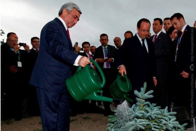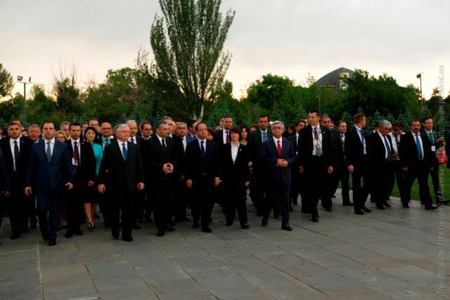 Հայաստանի նախագահ Սերժ Սարգսյանն ու պետական այցով մեր երկրում գտնվող Ֆրանսիայի նախագահ Ֆրանսուա Օլանդը երեկոյան այցելել են Ծիծեռնակաբերդի հուշահամալիր, ծաղկեպսակ դրել Մեծ եղեռնի հուշակոթողին, հարգանքի տուրք մատուցել Հայոց ցեղասպանության զոհերի հիշատակին: Ֆրանսիայի նախագահը եղևնի է տնկել Հիշողության պուրակում: Հայոց ցեղասպանության թանգարանի անունից նախագահ Օլանդին է հանձնվել Ոսկե հուշամեդալ: Թանգրան-ինստիտուտի տնօրեն Հայկ Դեմոյանը Ֆրանսուա Օլանդին է հանձնել նաև խորհրդանշական նվեր` Ֆրանսիայի կողմից 2001-ին ընդունած Ցեղասպանության ճանաչման մասին օրենքը` պատրաստված ապրիլի 24-ին