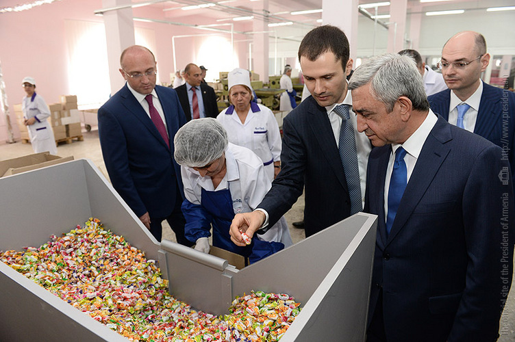 Հանրապետության Նախագահն այնուհետև այցելել է «Գրանդ Հոլդինգի» կազմի մեջ մտնող «Գրանդ Տոբակո» և «Գրանդ Քենդի» ընկերություններ: Նախագահը շրջել է արտադրամասերում, ծանոթացել հայրենական արտադրության առաջատարներից մեկը համարվող այդ ընկերության կողմից կատարված ներդրումներին ու գործարանի արտադրական հզորությունների մեծացման, ժամանակակից սարքավորումներով նոր արտադրամասերի գործարկման ուղղությամբ վերջին տարիներին իրականացված աշխատանքներին: Սերժ Սարգսյանին ներկայացրել են, որ «Գրանդ Հոլդինգի» կազմի մեջ մտնող ընկերությունները շարունակում են հաջողությամբ իրականացնել բոլոր նախանշված ծրագրերը` hավատարիմ մնալով Հրանտ Վարդանյանի կողմից ձևավորված գործարար ավանդույթներին, ինչի մասին են վկայում 2014թ. առաջին հինգ ամիսներին գրանցված տնտեսական ցուցանիշները: Պատասխանատուների հավաստմամբ, պլանավորված է աճի նույն տեմպերը պահպանել ամբողջ տարվա ընթացքում: «Գրանդ Տոբակոյում», ըստ ընկերության ղեկավարության, 2014թ. ընթացքում պլանավորված նոր հոսքագծերի ձեռքբերման հետ կապված կստեղծվի մոտ 100-130 նոր աշխատատեղ: Հոլդինգի մյուս ընկերությունում՝ «Գրանդ Քենդիում» Հանրապետության Նախագահին տեղեկացրել են, որ ընկերության կողմից արտադրվող 410 ապրանքատեսականին մինչև տարեվերջ կհամալրվի առնվազն 15-ով: «Գրանդ Քենդիում» աշխատատեղերի թիվը ներկայումս 3 100 է, որն ընկերության ղեկավարությունը ծրագրում է մինչև տարեվերջ ավելացնել ևս 150-ով: Ընդհանուր առմամբ, «Գրանդ Հոլդինգում» ներկայումս աշխատում է շուրջ 6 500 մարդ:
