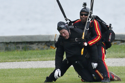 Բուշ-ավագը, որը տառապում է Պարկինսոնի հիվանդությամբ ու ստիպված է հաշմանդամի սայլակով տեղաշարժվել, ուղղաթիռից բանակային փորձառու պարաշյուտիստի հետ թռիչք է կատարել: Գետնի վրա նրան դիմավորել է կինը` Բարբարան ու որդին` Ջորջը: