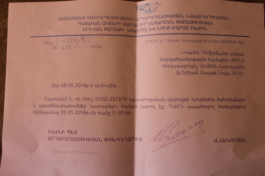 ԴԱՀԿ-ում օրացույցը հետ է աշխատում May 26, 2014 14:50 Մարզահամերգային համալիրի շուրջ ստեղծված անհասկանալի քաոսում պետական ատյանների խառնիճաղանջ, անտրամաբանական քայլերի ականատեսՆ ենք դառնում: Հերթական վառ ապացույցը ստորև փաստաթուղթն է, որը պատասխանն ...