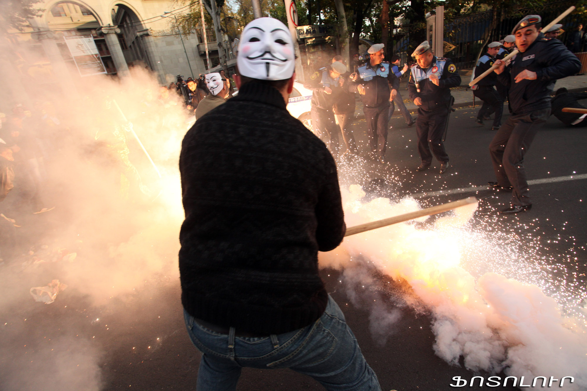 Ազատության հրապարակից այսօր ժամը 17։00-ին սկսված «Անոնիմուսների» երթը անսպասելի զարգացում է ունեցել: Փայտերով ու Գայ Ֆոքսի դիմակներով Շանթ Հարությունյանի կազմակերպած երթի մոտ 100 մասնակիցները շարժվել են դեպի Մաշտոցի պողոտա։ Այստեղ Շանթ Հարությունյանը ցանկացել է փողոցը անցնել արգելված վայրով, ոստիկանները նրան փորձել են արգելել փողոցն անցնել։ Շանթի կողմնակիցները փայտերով հարձակվել են ոստիկանների վրա, ոստիկանները պատասխանել են ռետինե մահակներով, սկսվել է ծեծուջարդը։ Երթի մասնակիցները վառվող բենզինի շշեր են պայթեցրել։